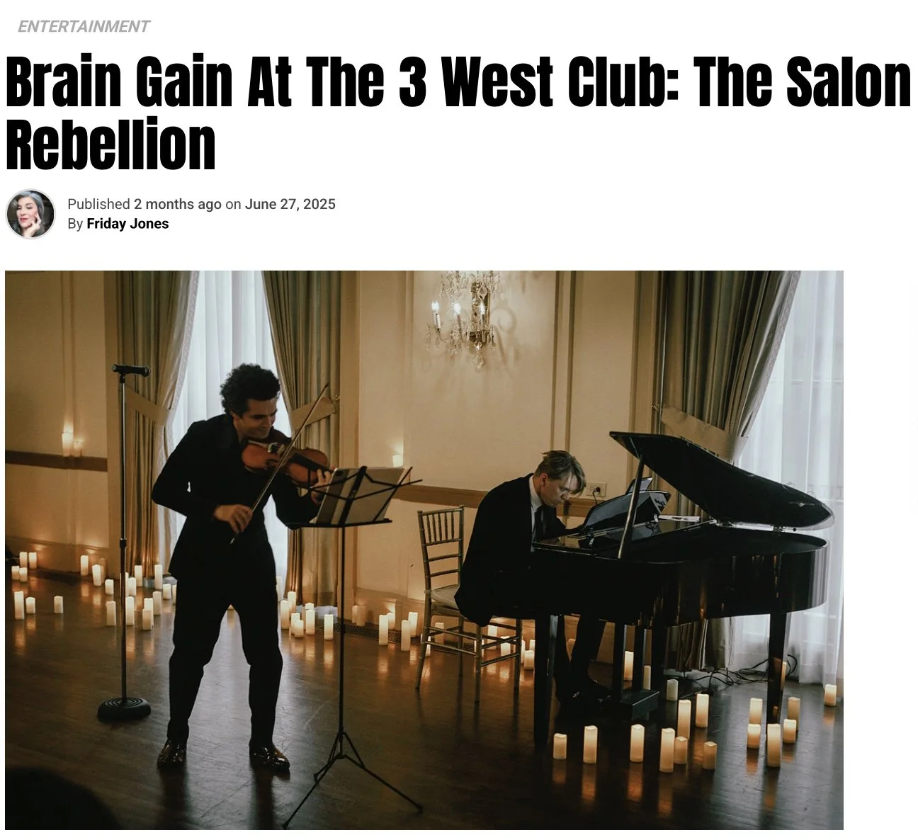 A musician playing the violin and another on the piano during a performance in an elegant room illuminated by candlelight and chandeliers.